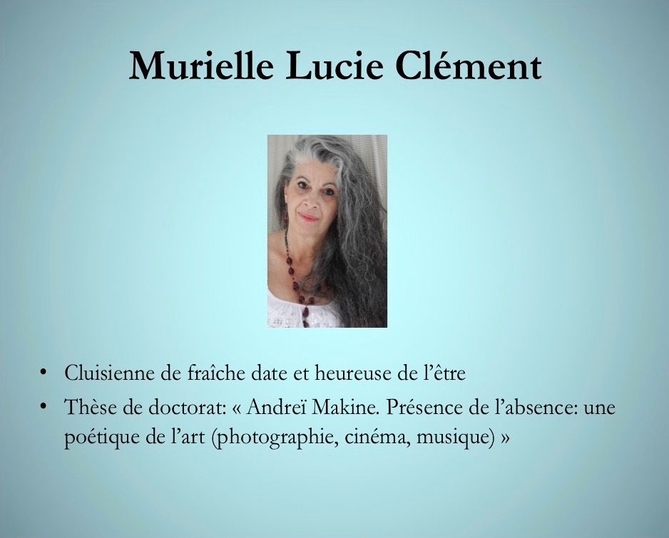 Murielle Lucie Clément est l’auteur d’une thèse de doctorat sur Andreï Makine Andreï Makine. Présence de l’absence : une poétique de l’art (photographie, cinéma, musique). Dans sa thèse, Clément étudie la fonction respective d’éléments que les formalistes russes auraient appelés « non littéraires ». L’intérêt de cette thèse réside dans l’approche précise de l’œuvre d’Andreï Makine. Plusieurs chercheurs ont mentionné l’art dans les romans, sans souligner leur enchevêtrement et la force de leurs descriptions. La pertinence de cette thèse niche aussi dans l’élargissement à l’outil bakhtinien rendu adéquat à l’analyse de textes d’auteurs bilingues.